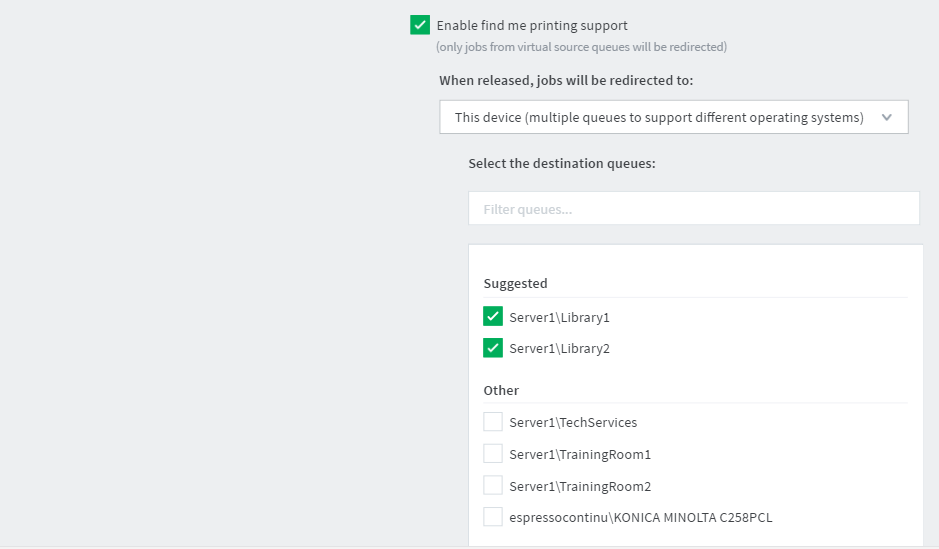 In Enable find me printing support > When released, jobs will be redirected to, select This device (multiple queues to support different operating systems).