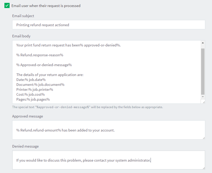 Other than the %approved-or-denied-message% marker, you can use the following markers in any of the above four fields: