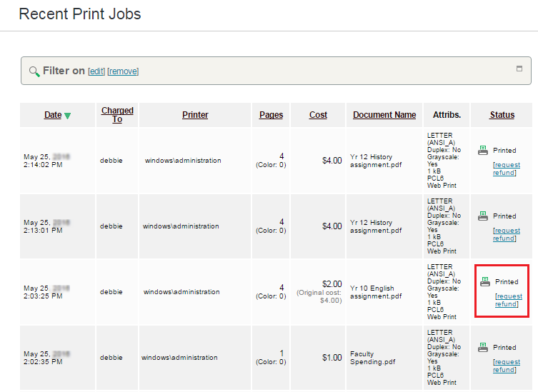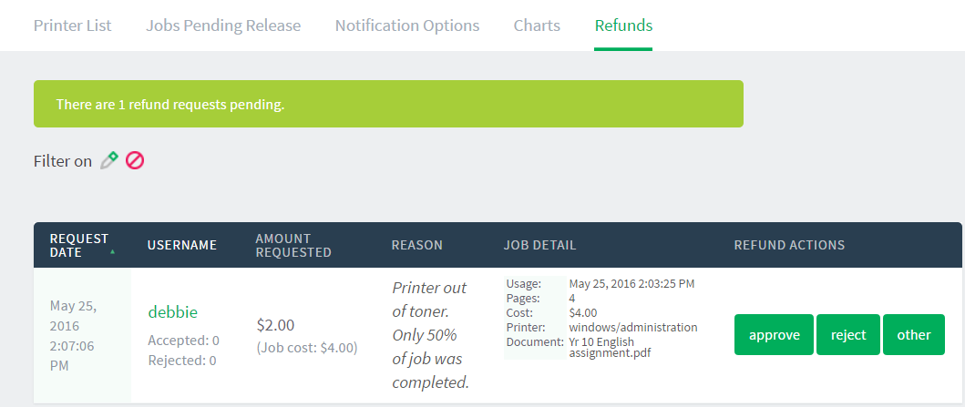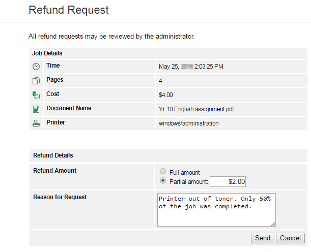 Paper jams, toner problems, and print quality issues always occur. Larger organizations require a policy to address these situations and under what conditions a print job can be refunded. The assessment to give a refund or not is subjective and needs to be managed by responsible administrators. To streamline and partially automate the process PaperCut NG/MF provides a browser based refund management process.