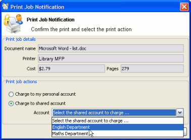 The PaperCut User Client displays a popup and presents Matt with information about the print jobs and requests an account selection. In this case accounts represent Departments but could also represent projects or other work areas.