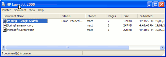 When the teacher, Matt, prints from his application, his workstation transfers the print job to the server and places it in the print queue.